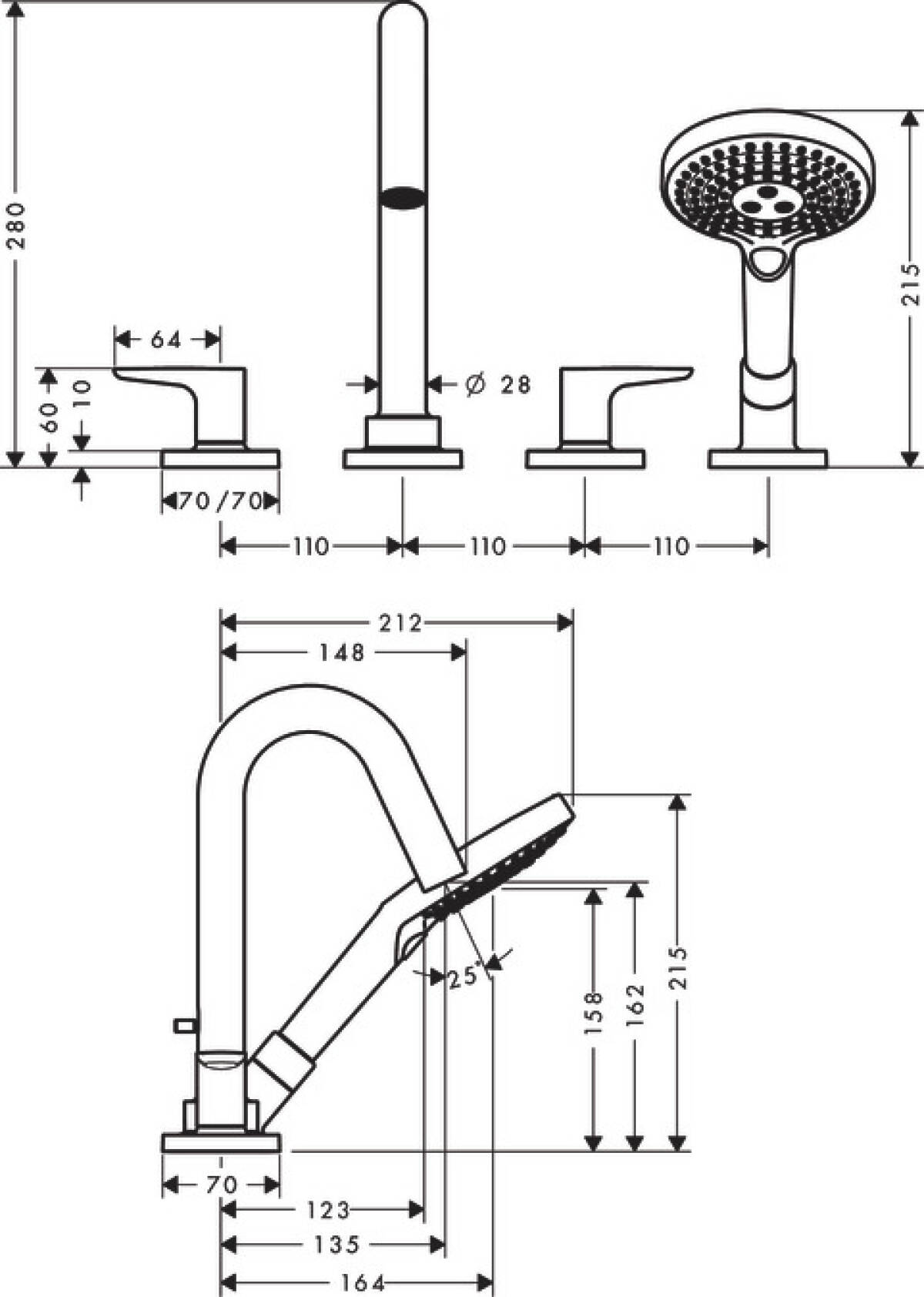 | consists of | 4-hole rim mounted bath mixer, hand shower, shower hose, shower holder |