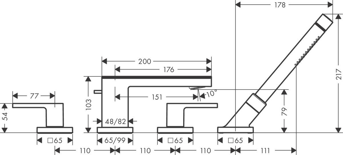 | consists of | 4-hole rim mounted bath mixer, plate, baton hand shower, Secuflex hose set, shower holder |