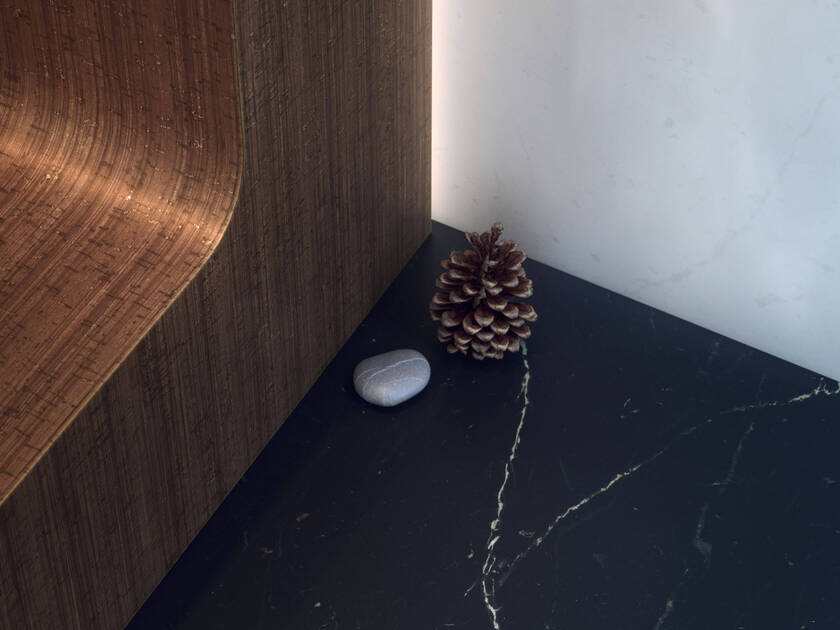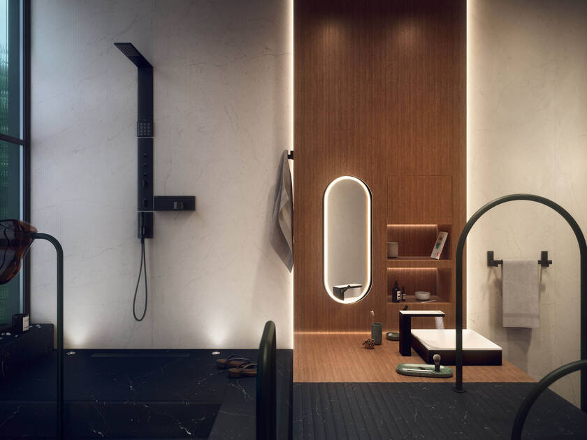 Situando la narración en las montañas de la Selva Negra, el diseño de espacios se abrió a un tercer plano. «Queríamos utilizar los 15 metros cuadrados con un enfoque innovador y bien estudiado», relata Tamborriello. «No nos limitamos a movernos de delante a atrás y de izquierda a derecha; también lo hicimos de abajo a arriba». Esto se plasma en un gran marco que domina toda la estructura del baño, dividiéndolo en una zona anterior activa, dotada de lavabos, estantes y asientos, y en un espacio trasero más contemplativo, con la bañera y la ducha emplazadas ante un sensacional panorama. El vínculo entre ambos ambientes se efectúa a través de una delicada escalera de piscina, un motivo esencial y cargado de simbolismo, un sutil nexo de unión entre mundos diferentes.