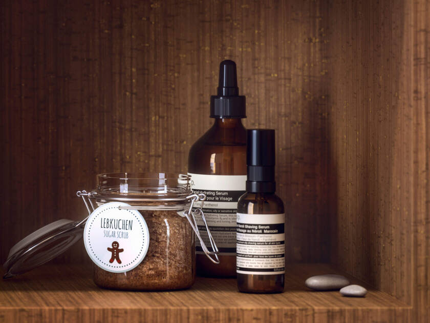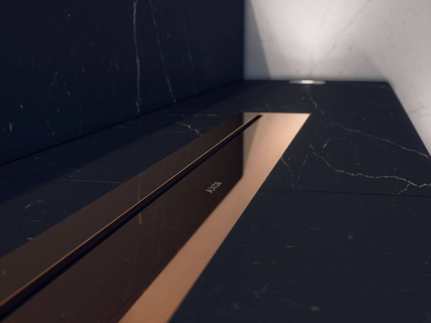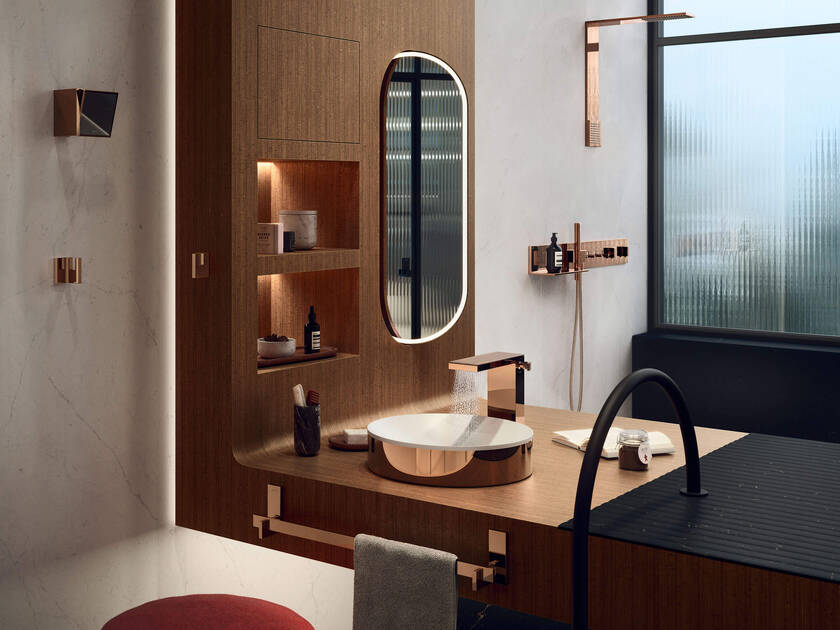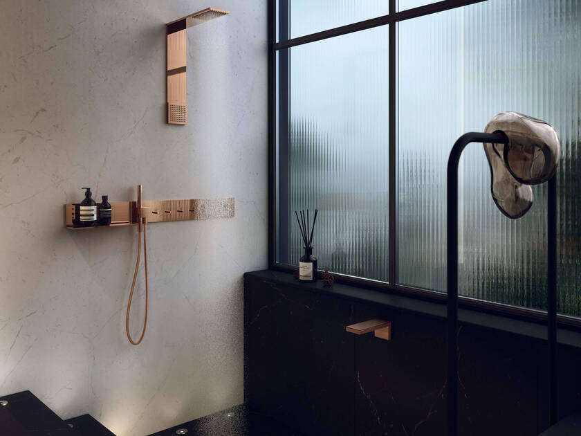 En todas las zonas, la sutil iluminación de Jörg Krewinkel y su equipo de Lichtkompetenz acentúa la atmósfera íntima y apacible. En el espacio de ducha, la ventana de vidrio corrugado preserva la privacidad y al mismo tiempo tiende un puente al mundo exterior. Estos detalles contribuyen a crear un espacio acorde con una tendencia global: la demanda de baños que además de ofrecer un refugio de la vida diaria también sirvan de escenario de autorrealización. Estos dos deseos se dan la mano en «Gretel y Hansel»; por ejemplo, en el panel de ducha AXOR ShowerComposition en negro mate o en el caño de bañera AXOR MyEdition de montaje mural, adornado con una placa de nogal americano. El módulo de ducha AXOR ShowerComposition con teleducha y módulo de termostato en oro rojo pulido brinda una oportunidad adicional de personalización. Los AXOR Universal Rectangular Accesorios se erigen en esculturas funcionales en todo el baño, vestidas de oro rojo pulido o negro mate.