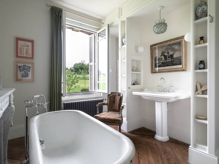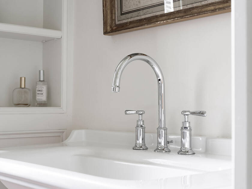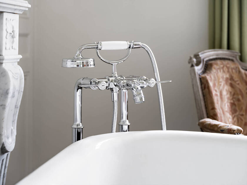 Nel bagno, che originariamente fungeva da anticamera, una vasca da bagno freestanding con piedi a zampa di leone cattura lo sguardo. A spiccare è anche la rubinetteria vasca AXOR Montreux a pavimento, la cui estetica è caratterizzata dal design industriale dei primi anni del ventesimo secolo. Posta davanti al camino e a uno specchio ad altezza parete, la rubinetteria ricorda lo charme dei lussuosi bagni della Belle Époque dei grand hotel europei. A completare questo ambiente bagno classico, sul lavabo trova spazio una rubinetteria a tre fori AXOR Montreux con uscita alta e curva e leve separate.