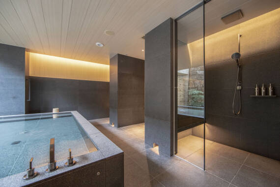 ゆったりと寛げる、贅沢な空間には温泉やシャワーブースの他にウェットリビングスペースも完備。