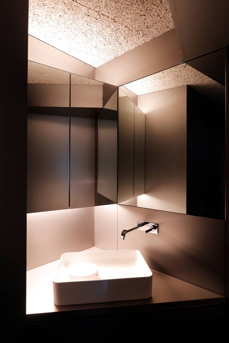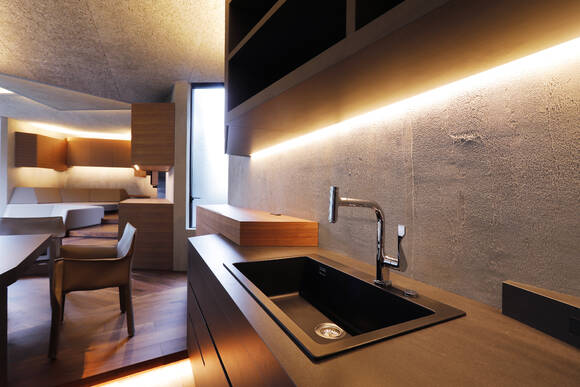 「すべては必然を重ねているだけ。何もないところから生み出されるものは何もありません。今回は自然の岩山をイメージし、自然の造形の法則に習って、一つ一つ丁寧に削りこむように膨大な作業を積み重ねて、全体の構成を作り上げました。必要な機能は家具として造形し、全体の空間造形と調和するように注意深く各所を練り上げていきました。無駄なものは無いと思います。試行錯誤の蓄積は裏切りませんから。」