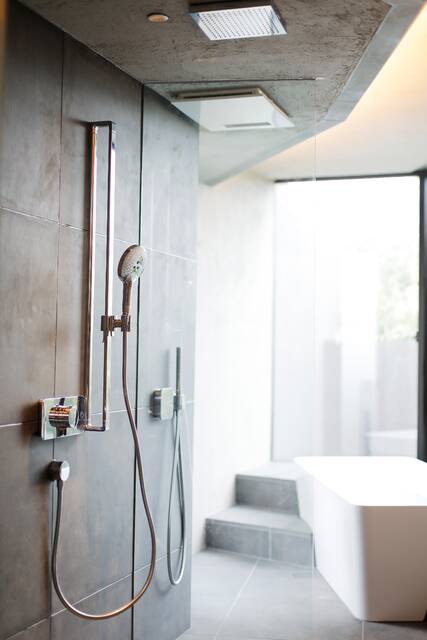 シャワーブースのアプローチを抜けると、開放感のある浴室が広がる。オーバーヘッドシャワーとハンドシャワーは、自然の雨をモチーフにしたシャワーモード"レインダンス"を搭載したものを採用。たっぷりとした空気を含んでおり、大粒で柔らかい肌あたりが特徴です。