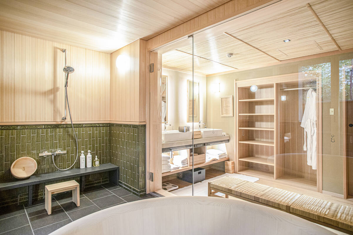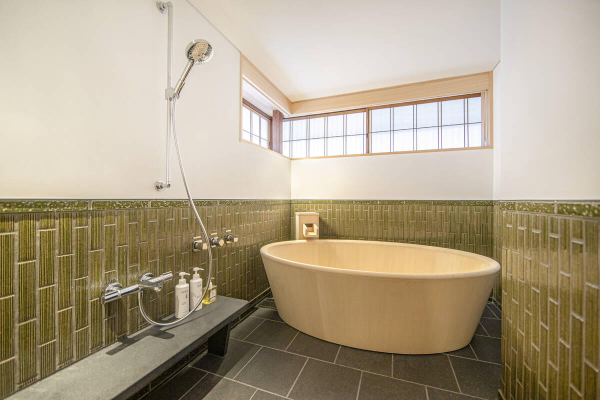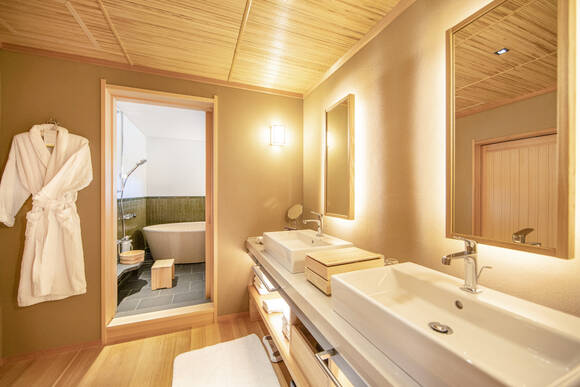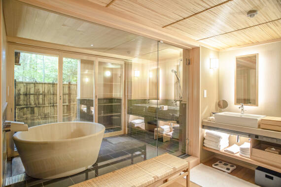 バスルームは、室内と屋外が一体化したような開放的な印象。上質な天然素材をふんだんに取入れた空間に、柔らかく差し込む自然光が癒しをもたらします。