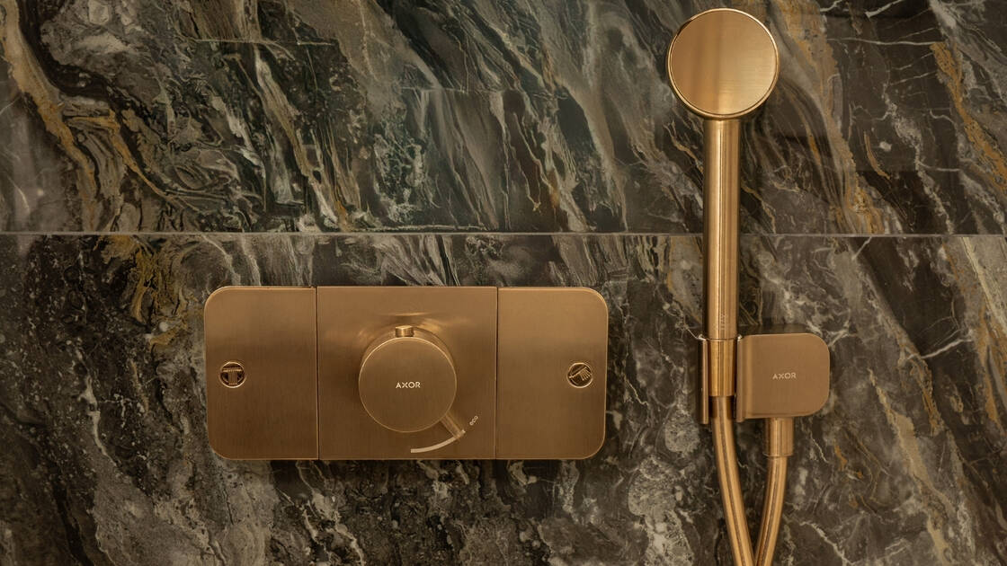 De AXOR One-inbouwwastafelkraan, de thermostaatmodule en de combinatie van hoofddouche en handdouche delen dezelfde vormentaal. Allemaal in Brushed Bronze afwerking, waardoor één rustig en stijlvol geheel ontstaat dat precies past bij de uitstraling van het Ambassade Hotel.