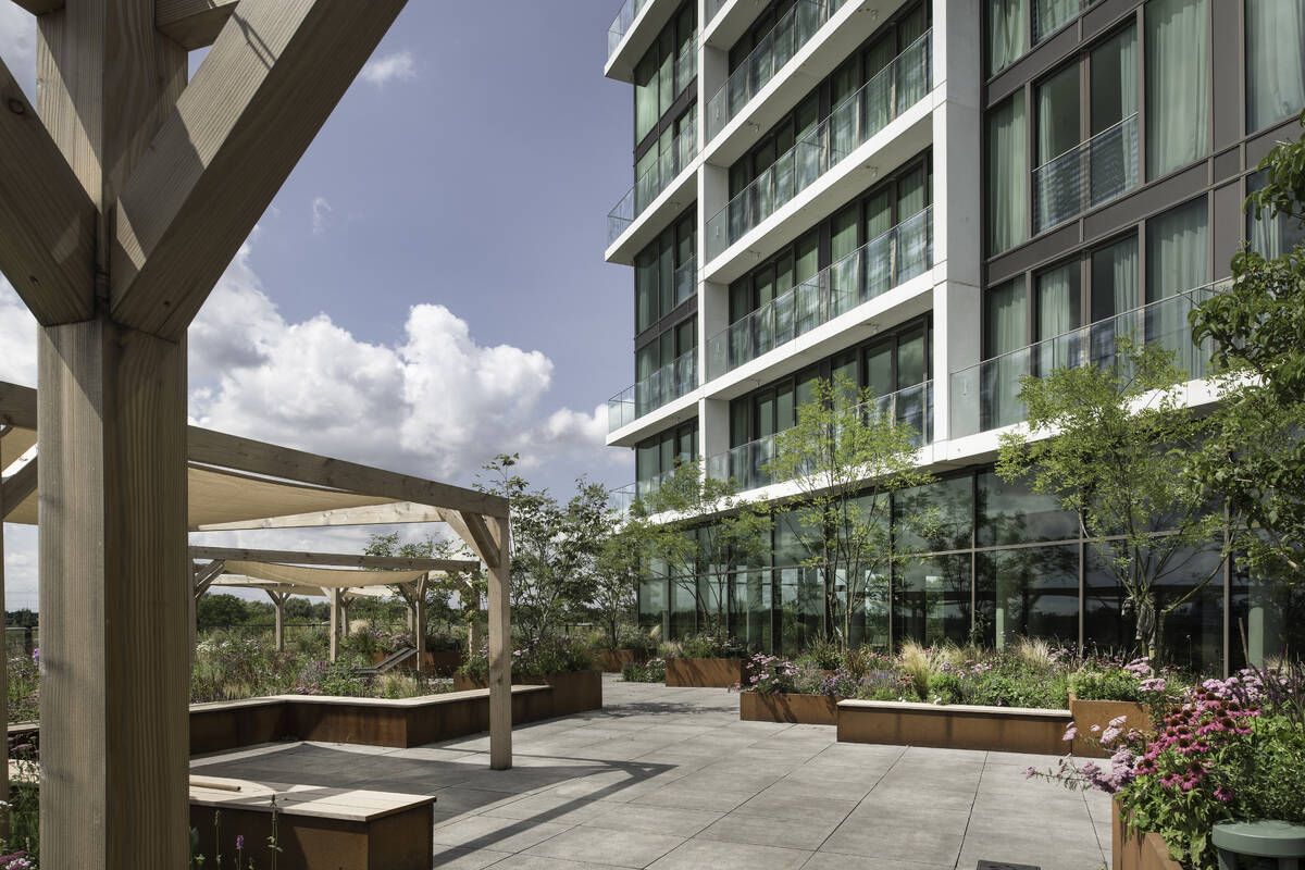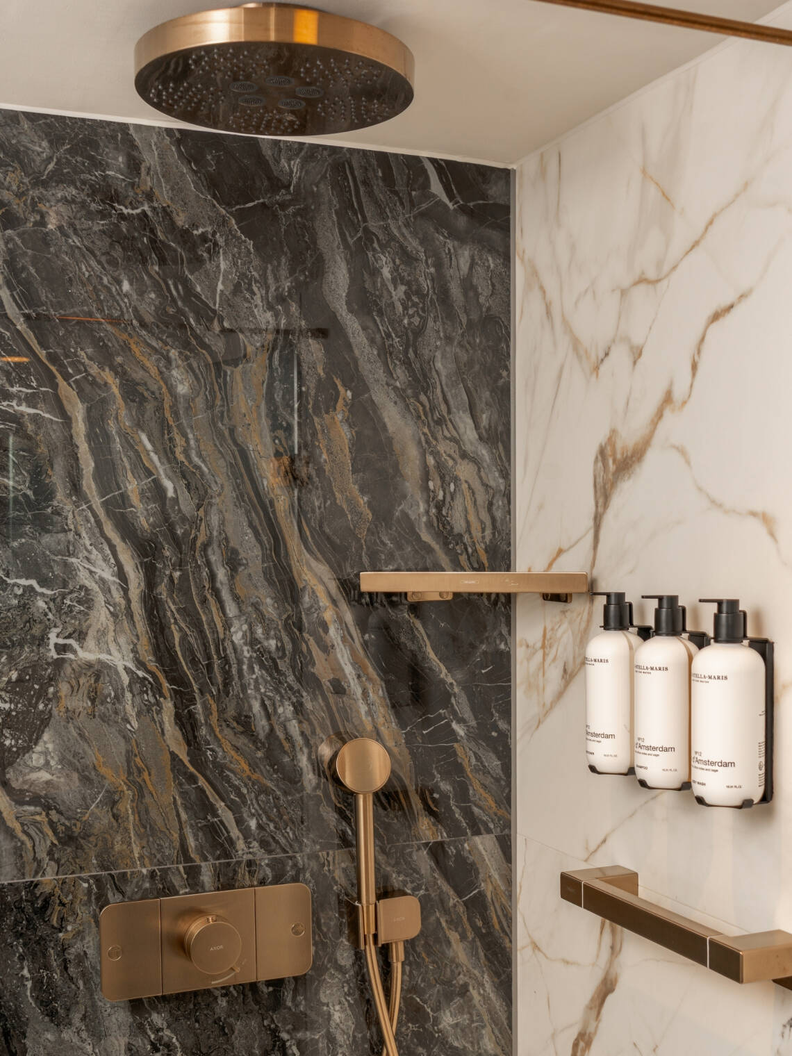 Dat zie je duidelijk terug in de badkamers. Luxe, comfort en duurzaamheid stonden voorop in het ontwerp. Nijdam liet zich inspireren door de klassieke marmeren badkamers van Amsterdamse grachtenpanden, maar koos omwille van onderhoud en duurzaamheid voor een keramische marmerlook tegel met een bronzen nerf. Daarbij kwam de AXOR One-serie in Brushed Bronze, ontworpen door Edward Barber en Jay Osgerby. Minimalistisch, zacht van vorm en helemaal gericht op intuïtief gebruik.
