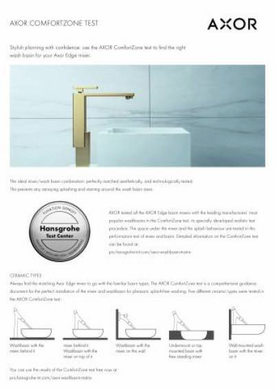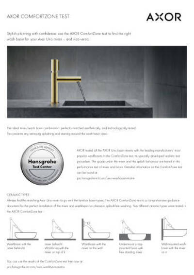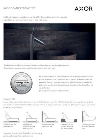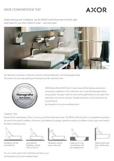 Bekvämt och informativt: Här kan du ladda ner broschyrer om enskilda AXOR-kollektioner och -ytor, magasin om nyheter och översikter av ComfortZone-test. Det senare visar olika tvättställ i kombination med olika AXOR-kollektioner, som är optimalt anpassade till varandra och som är tekniskt testade. På så sätt undviker du vattenstänk och vattenfläckar runt tvättstället, och uppnår en mer stilsäker och perfekt planering.