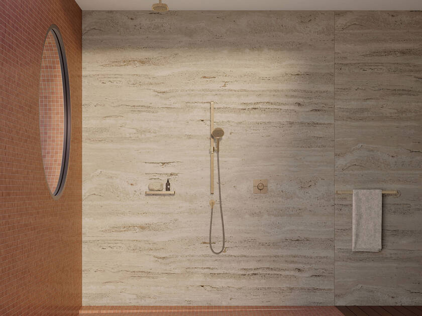 An AXOR ShowerSelect ID thermostat and function diverter allow for the comfortable, intuitive control of this multi-faceted water experience. An AXOR Drain as well as hanging and storage items from the AXOR Universal Softsquare Accessories complete the product specification. Finished in Brushed Nickel, the selected products span several ranges yet form a harmonious, functional whole that reflects the spirit of the surroundings.